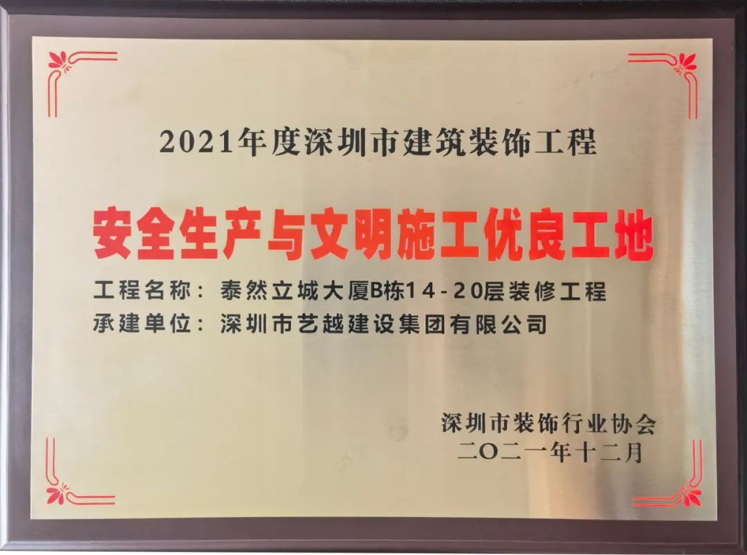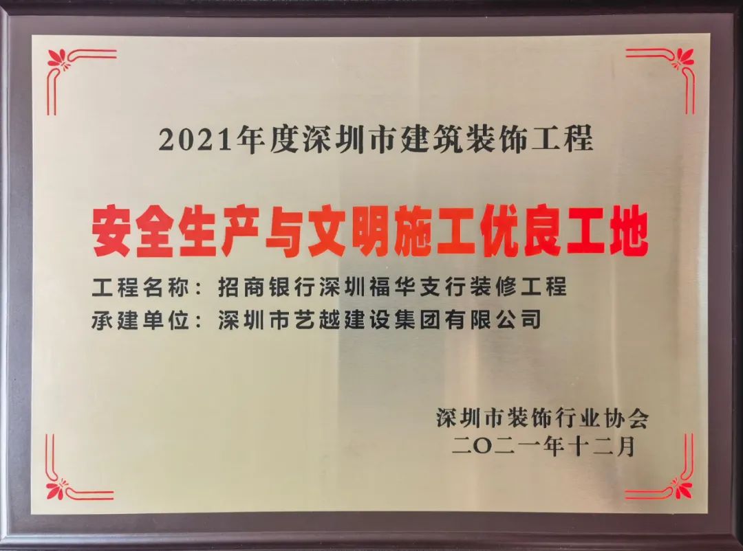 2021年12月,深圳裝飾行業(yè)協(xié)會(huì)開展了“2021年度深圳市建筑裝飾工程安全生產(chǎn)與文明施工優(yōu)良工地”評(píng)選工作,經(jīng)專家組嚴(yán)格評(píng)審,由藝越建設(shè)集團(tuán)承建的“泰然立城大廈B棟14-20層裝修工程”和“招商銀行深圳福華支行裝修工程”被評(píng)為“2021年度深圳市建筑裝飾工程安全生產(chǎn)與文明施工優(yōu)良工地”。