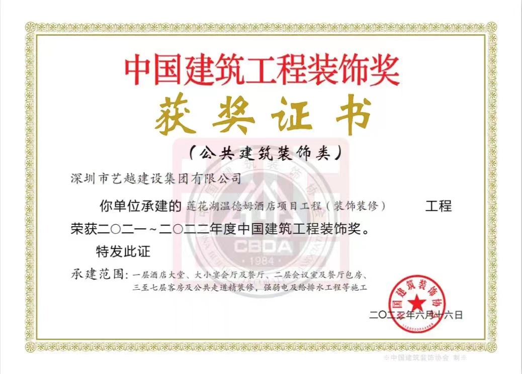 喜訊來臨,在各級領導的關懷和全體家人們的共同努力下,由藝越建設承接的”蓮花湖溫德姆酒店項目工程(裝飾裝修)“榮獲“中國建筑工程裝飾獎”,為我司榮譽墻再添新的勛章!