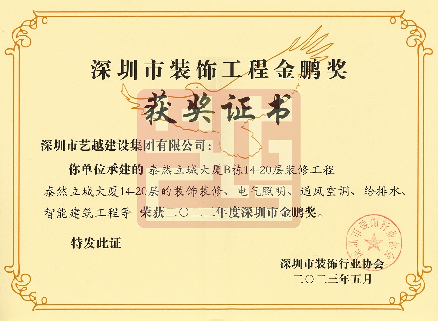 近期,在深圳市裝飾行業(yè)協(xié)會發(fā)布的“2022年度深圳市裝飾工程金鵬獎”評選結(jié)果公告中,由藝越建設(shè)承建的: