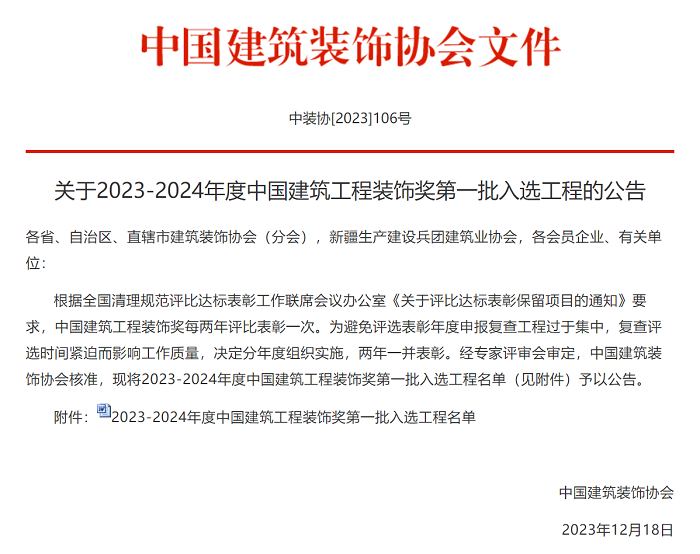 近日,2023-2024年度中國建筑工程裝飾獎第一批入選工程評選結(jié)果揭曉,藝越建設(shè)兩項精品工程榮獲全國建筑裝飾行業(yè)最高榮譽獎。