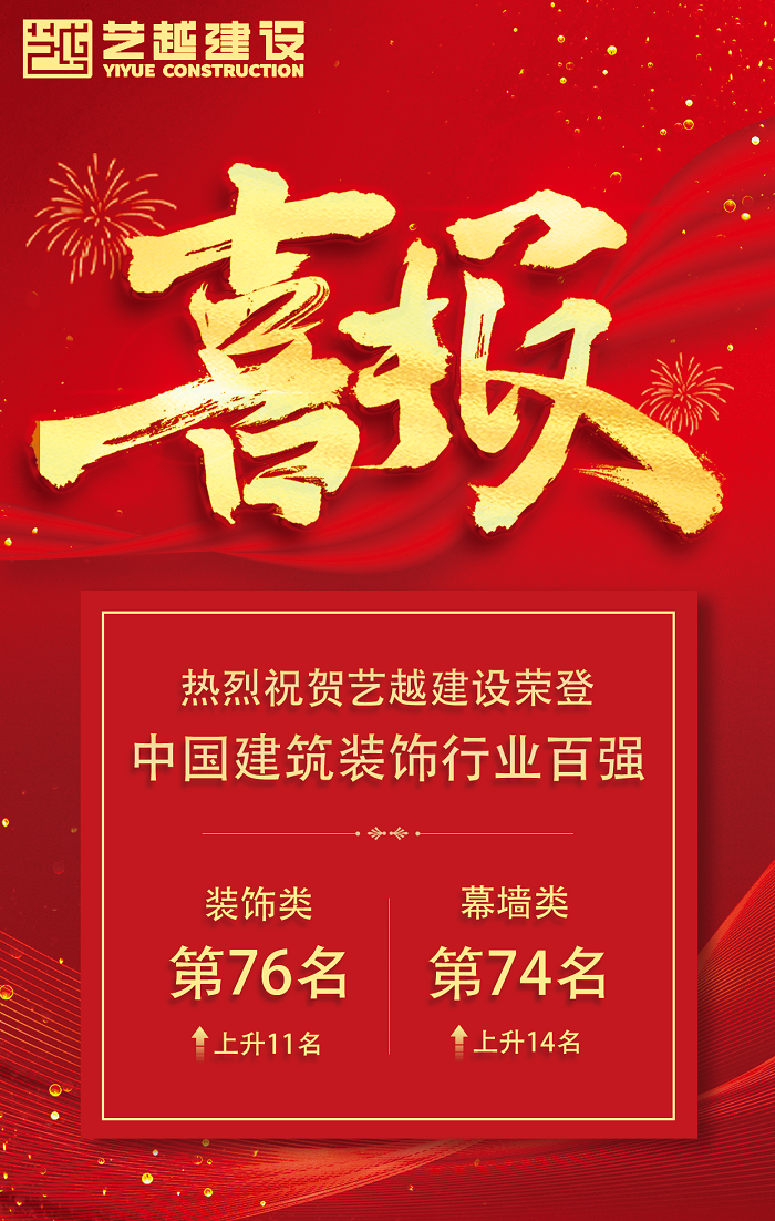 2023年12月13日,中國(guó)建筑裝飾協(xié)會(huì)正式發(fā)布了《2022年度中國(guó)建筑裝飾行業(yè)綜合數(shù)據(jù)統(tǒng)計(jì)結(jié)果公告》,藝越建設(shè)集團(tuán)再度榮登百?gòu)?qiáng)榜單,分別獲得裝飾類(lèi)第76位,幕墻類(lèi)第74位榮譽(yù),排名均較上一年度有所提升。