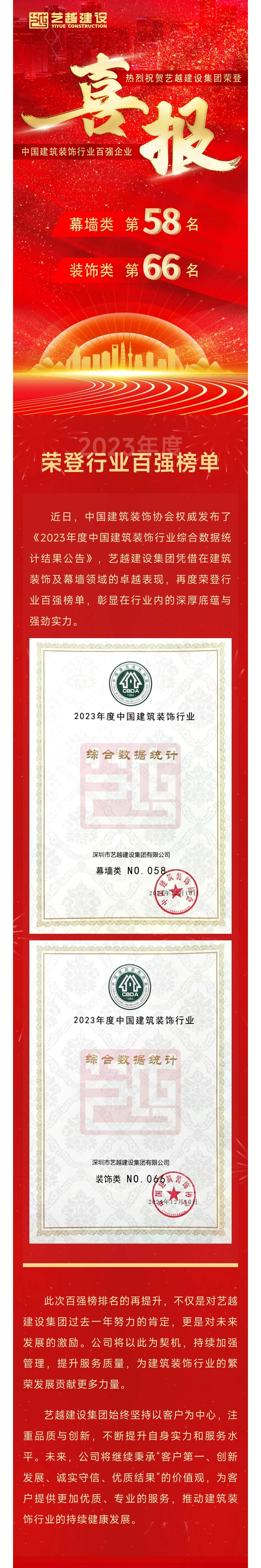 深圳市藝越建設(shè)集團(tuán)有限公司,成立于2010年10月22日,注冊(cè)資金為6180萬元,是一家是集建筑、室內(nèi)外裝飾設(shè)計(jì)與施工、智能化、市政于一體的綜合性、專業(yè)化的集團(tuán)公司。具有建筑裝修裝飾工程專業(yè)承包壹級(jí)、建筑幕墻工程專業(yè)承包壹級(jí)、建筑機(jī)電安裝工程專業(yè)承包壹級(jí)、消防設(shè)施工程專業(yè)承包壹級(jí)、鋼結(jié)構(gòu)工程專業(yè)承包壹級(jí)、中國展協(xié)展覽工程企業(yè)壹級(jí)、中國展協(xié)展覽陳列工程設(shè)計(jì)與施工壹級(jí)、潔凈工程資質(zhì)壹級(jí)、防水防腐保溫工程專業(yè)承包壹級(jí)、特種工程(結(jié)構(gòu)補(bǔ)強(qiáng))不分等級(jí)、建筑裝飾工程設(shè)計(jì)專項(xiàng)甲級(jí)、建筑幕墻工程設(shè)計(jì)專項(xiàng)甲級(jí)、輕型鋼結(jié)構(gòu)工程設(shè)計(jì)專項(xiàng)乙級(jí)、消防設(shè)施工程設(shè)計(jì)專項(xiàng)乙級(jí)、建筑工程施工總承包貳級(jí)、市政公用工程施工總承包貳級(jí)、電子與智能化工程專業(yè)承包貳級(jí)、城市及道路照明工程專業(yè)承包貳級(jí)、環(huán)保工程專業(yè)承包貳級(jí)、施工勞務(wù)不分等級(jí)、承裝(修、試)電力設(shè)施許可證叁級(jí)、醫(yī)療器械經(jīng)營許可資質(zhì)貳、叁類、安全技術(shù)防范系統(tǒng)設(shè)計(jì)施工維修資格。質(zhì)量管理體系(GB/T19001-2016 / ISO9001:2015)標(biāo)準(zhǔn)認(rèn)證、職業(yè)健康安全管理體系(GB/T28001-2011)標(biāo)準(zhǔn)認(rèn)證,環(huán)境管理體系(GB/T24001-2016/ISO14001:2015)標(biāo)準(zhǔn)認(rèn)證,誠信管理體系(GB/T 31950-2023)標(biāo)準(zhǔn)認(rèn)證,售后管理體系(GB/T27922-2011)標(biāo)準(zhǔn)認(rèn)證。中國建筑裝飾協(xié)會(huì)常務(wù)理事單位、AAA資信單位、連續(xù)十四年被評(píng)為“守合同重信用企業(yè)”。