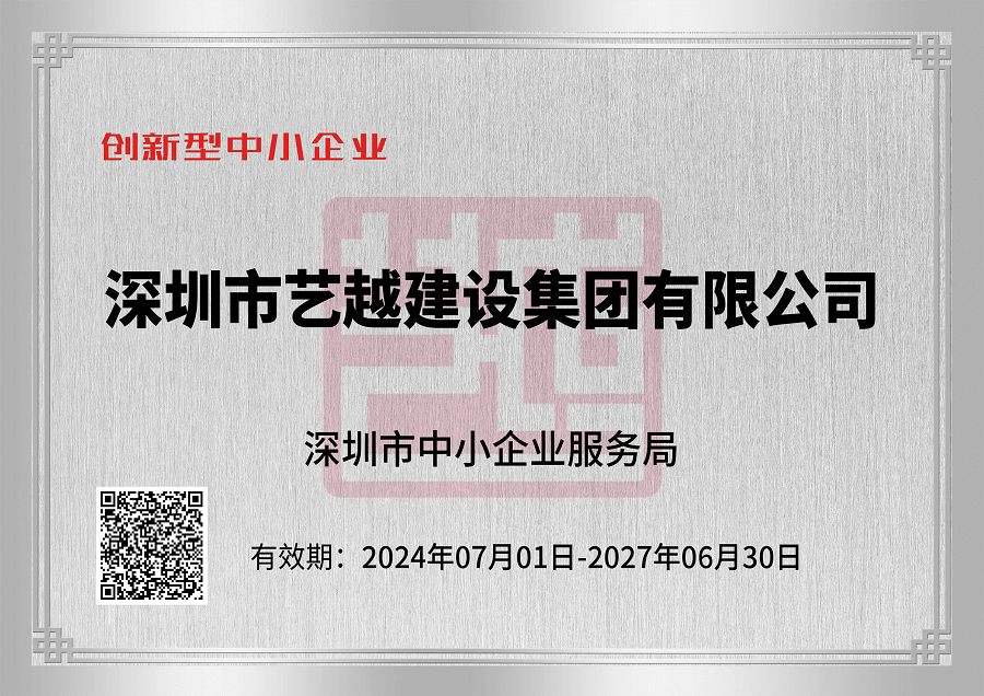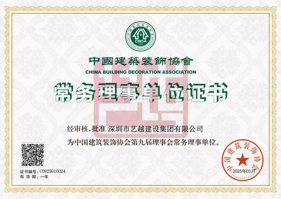深圳市藝越建設集團有限公司,成立于2010年10月22日,注冊資金為6180萬元,是一家是集建筑、室內外裝飾設計與施工、智能化、市政于一體的綜合性、專業(yè)化的集團公司。具有建筑裝修裝飾工程專業(yè)承包壹級、建筑幕墻工程專業(yè)承包壹級、建筑機電安裝工程專業(yè)承包壹級、消防設施工程專業(yè)承包壹級、鋼結構工程專業(yè)承包壹級、中國展協(xié)展覽工程企業(yè)壹級、中國展協(xié)展覽陳列工程設計與施工壹級、潔凈工程資質壹級、防水防腐保溫工程專業(yè)承包壹級、特種工程(結構補強)不分等級、建筑裝飾工程設計專項甲級、建筑幕墻工程設計專項甲級、輕型鋼結構工程設計專項乙級、消防設施工程設計專項乙級、建筑工程施工總承包貳級、市政公用工程施工總承包貳級、電子與智能化工程專業(yè)承包貳級、城市及道路照明工程專業(yè)承包貳級、環(huán)保工程專業(yè)承包貳級、施工勞務不分等級、承裝(修、試)電力設施許可證叁級、醫(yī)療器械經營許可資質貳、叁類、安全技術防范系統(tǒng)設計施工維修資格。質量管理體系(GB/T19001-2016 / ISO9001:2015)標準認證、職業(yè)健康安全管理體系(GB/T28001-2011)標準認證,環(huán)境管理體系(GB/T24001-2016/ISO14001:2015)標準認證,誠信管理體系(GB/T 31950-2023)標準認證,售后管理體系(GB/T27922-2011)標準認證。中國建筑裝飾協(xié)會常務理事單位、AAA資信單位、連續(xù)十四年被評為“守合同重信用企業(yè)”。